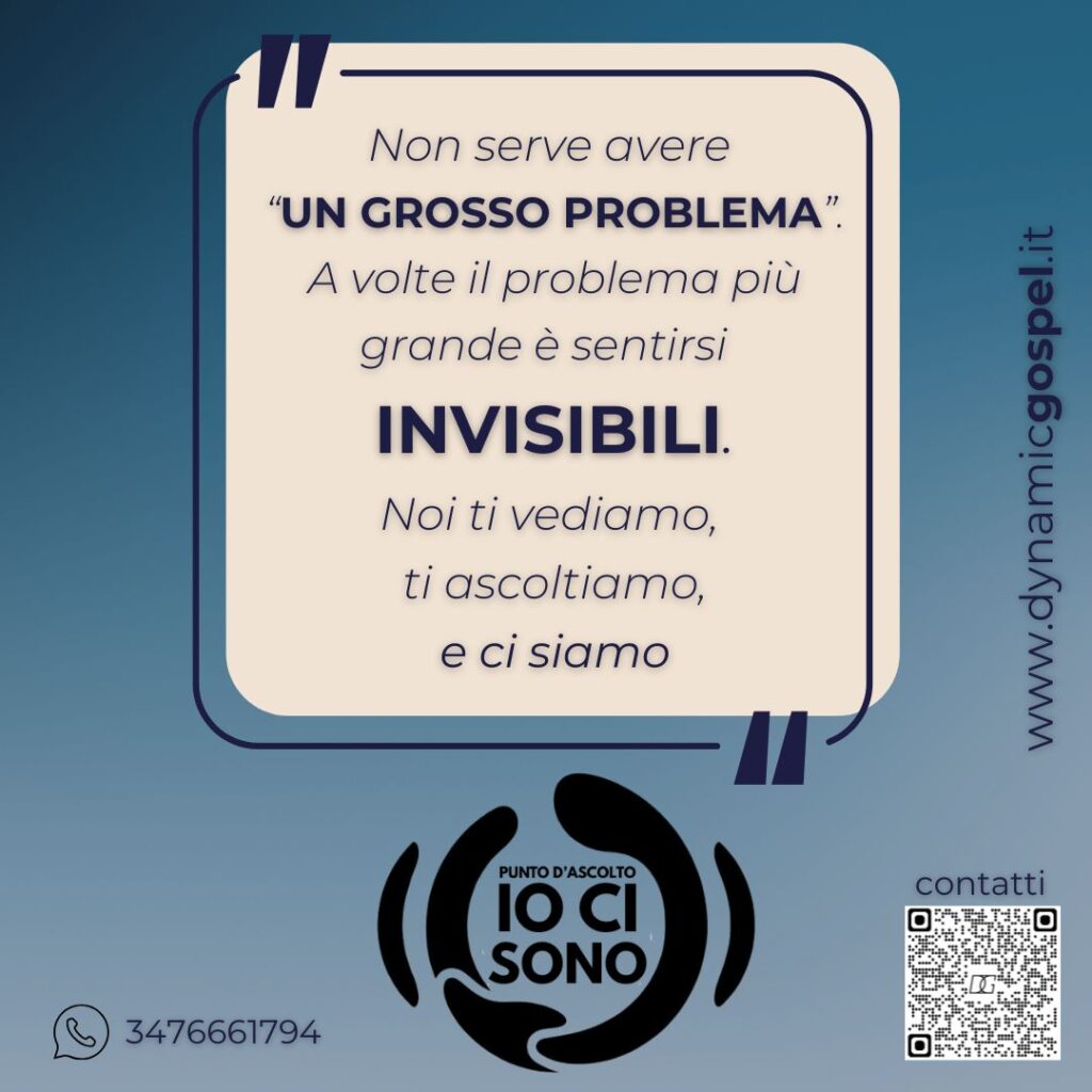 Il PUNTO D’ASCOLTO IO CI SONO è formato da un gruppo di persone, pronte ad ascoltare con empatia, senza nessun giudizio, ad affiancare nel percorso verso chiarezza, speranza e guarigione.